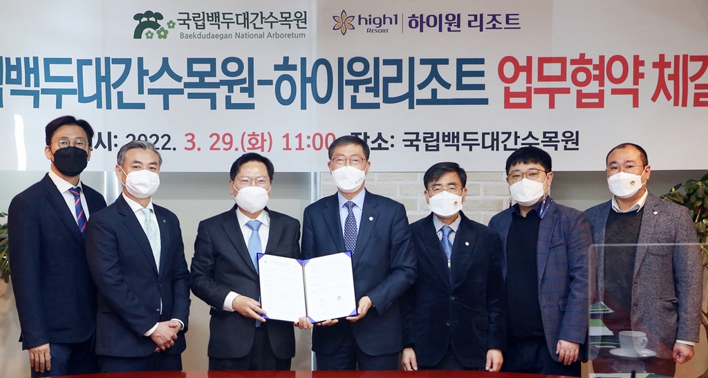 (정선=연합뉴스) 배연호 기자 = 강원 정선군 하이원리조트는 영남권 테마관광 경쟁력 강화와 친환경 그린뉴딜 선도를 위해 국립백두대간수목원·국립산림치유원과 업무협약을 했다고 30일 밝혔다.