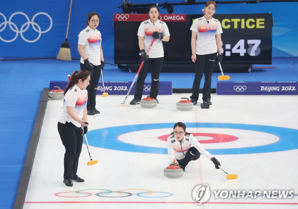 | ▲  Members of the South Korean women's curling team at Beijing 2022 practice at the National Aquatics Centre in Beijing on Feb. 9, 2022. (Yonhap) |