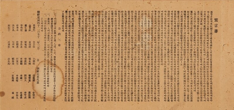 | ▲ '기미독립선언서' 독립선언서 왼쪽 두 번째 줄 상단에 적힌 '오세창'의 이름 [국립중앙박물관 제공. 재판매 및 DB 금지] |