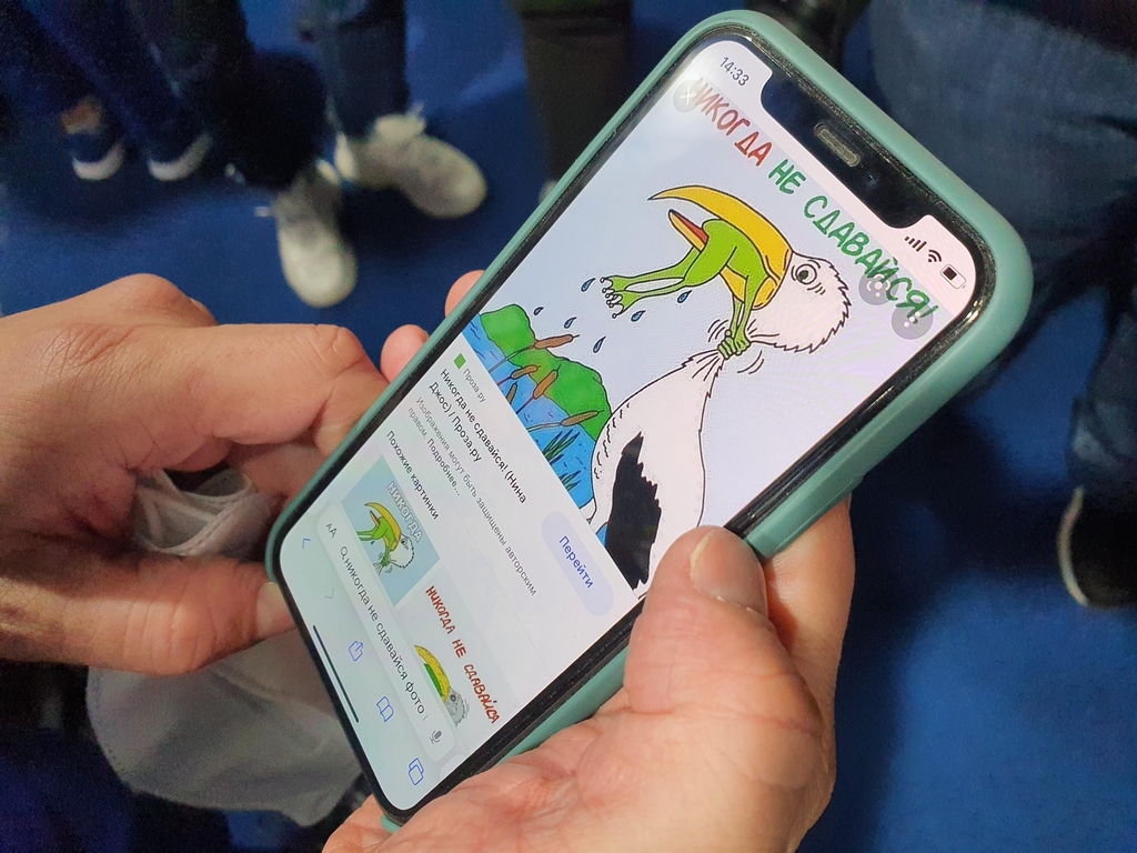 루슬란씨는 예바가 말하는 동안 새가 개구리를 잡아먹으려 하는데 개구리가 끝까지 살아남는다는 내용의 우크라이나 옛이야기의 그림을 자신의 휴대전화로 보여줬다. 예바는 "우크라이나는 절대로 포기하지 않는다"고 말했다.
