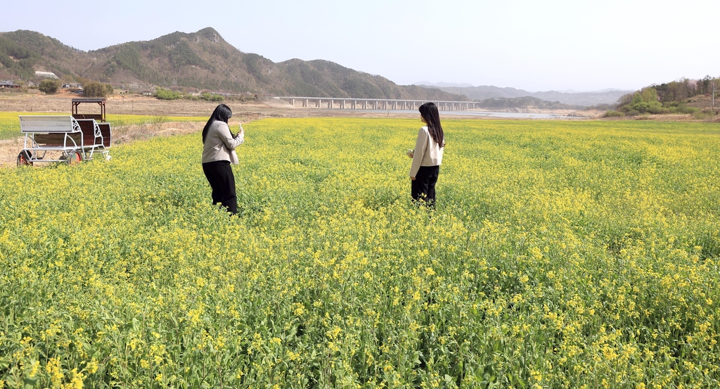 (진안=연합뉴스) 최영수 기자 = 용담호 주변인 전북 진안군 상전면 금지·양지마을 일대에 유채꽃이 만발해 나들이 명소로 주목받고 있다.