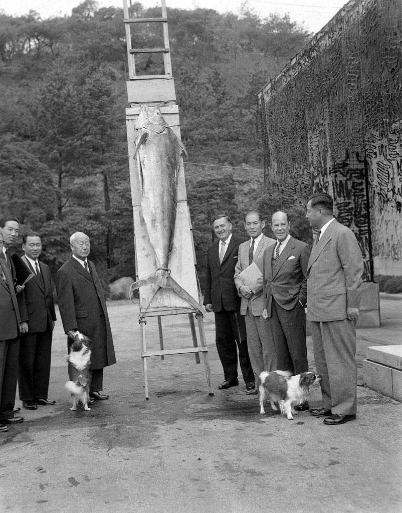 | ▲ 원양 해역에서 잡은 청새치를 감상하는 이승만 전 대통령 모습 국가기록원 소장 사진 [대한민국역사박물관 제공. 재판매 및 DB 금지] |