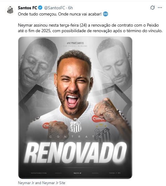 네이마르는 재계약 후 "산투스는 단순한 팀이 아니라, 내 고향이자 뿌리이자 역사이자 삶"이라면서 "이곳이 바로 내 경력에서 놓친 꿈을 이루고 싶은 곳이다. 모든 것이 시작된 곳이자 절대 끝나지 않을 곳"이라고 말했다.