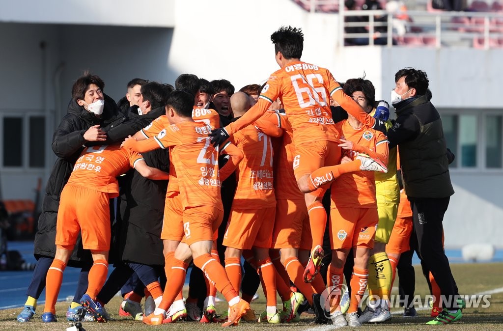 | ▲ Han Kook-young of Gangwon FC (C) celebrates his goal against Daejeon Hana Citizen during the second leg of the K League promotion-relegation playoffs at Gangneung Stadium in Gangneung, some 240 kilometers east of Seoul, on Dec. 12, 2021. (Yonhap) |