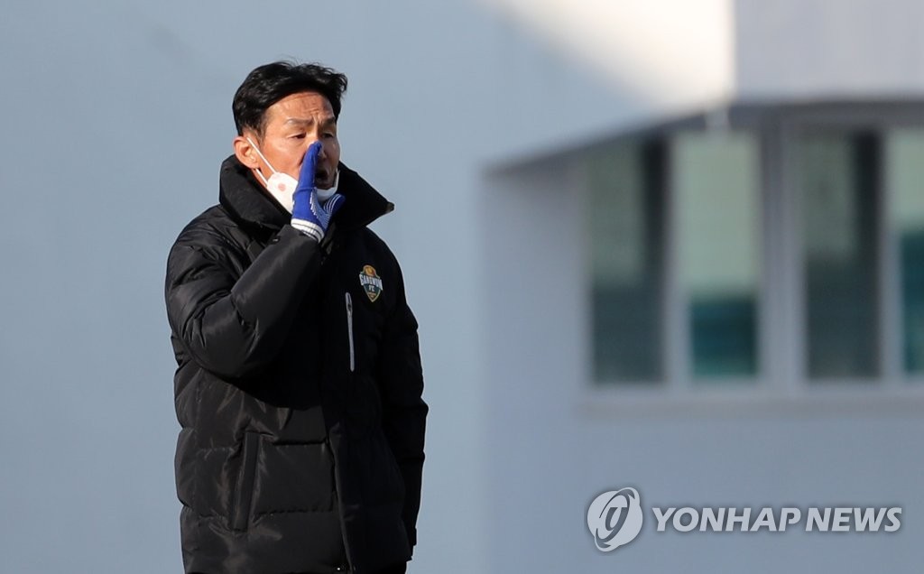 | ▲ Gangwon FC head coach Choi Yong-soo directs his players against Daejeon Hana Citizen during the second leg of the K League promotion-relegation playoffs at Gangneung Stadium in Gangneung, some 240 kilometers east of Seoul, on Dec. 12, 2021. (Yonhap) |