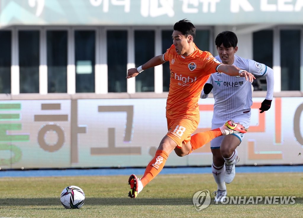 | ▲ Lee Jung-hyub of Gangwon FC (L) attempts a pass against Daejeon Hana Citizen during the second leg of the K League promotion-relegation playoffs at Gangneung Stadium in Gangneung, some 240 kilometers east of Seoul, on Dec. 12, 2021. (Yonhap) |
