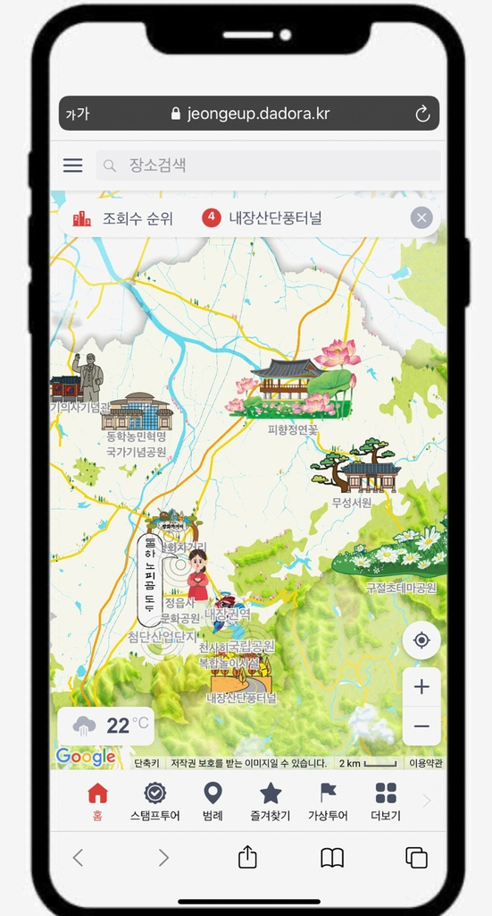(정읍=연합뉴스) 김동철 기자 = 전북 정읍시는 지역 관광지와 교통정보를 한눈에 볼 수 있는 '스마트 관광 전자지도'를 구축하고 12일부터 서비스를 시작했다.