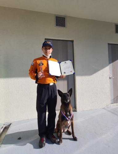 (의정부=연합뉴스) 최재훈 기자 = 경기도 북부소방재난본부는 119 인명구조견 '태공'과 핸들러 오문경 소방장이 제11회 소방청장배 전국 119 구조견 경진대회에서 종합 2위를 차지했다고 2일 밝혔다.