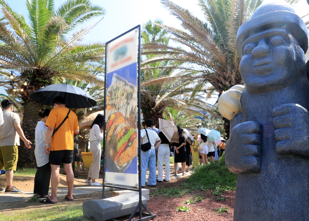 그늘 밖에서 줄을 서 있는 관광객과 도민은 오전부터 뜨거운 열기를 내뿜는 태양 아래서 연신 부채질을 해댔다.