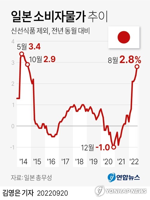 일본 8월 소비자물가 2.8% 상승…31년 만에 최대폭(종합)