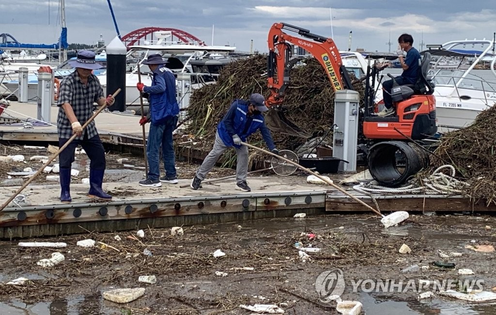 | ▲ 속초시 태풍피해 구슬땀 (속초=연합뉴스) 11일 태풍 피해를 본 강원 속초시 요트시설 선착장에서 자원봉사자들이 쓰레기를 치우는 복구작업을 하고 있다. 2023.8.11 [속초시 제공.재판매 및 DB 금지] hak@yna.co.kr |