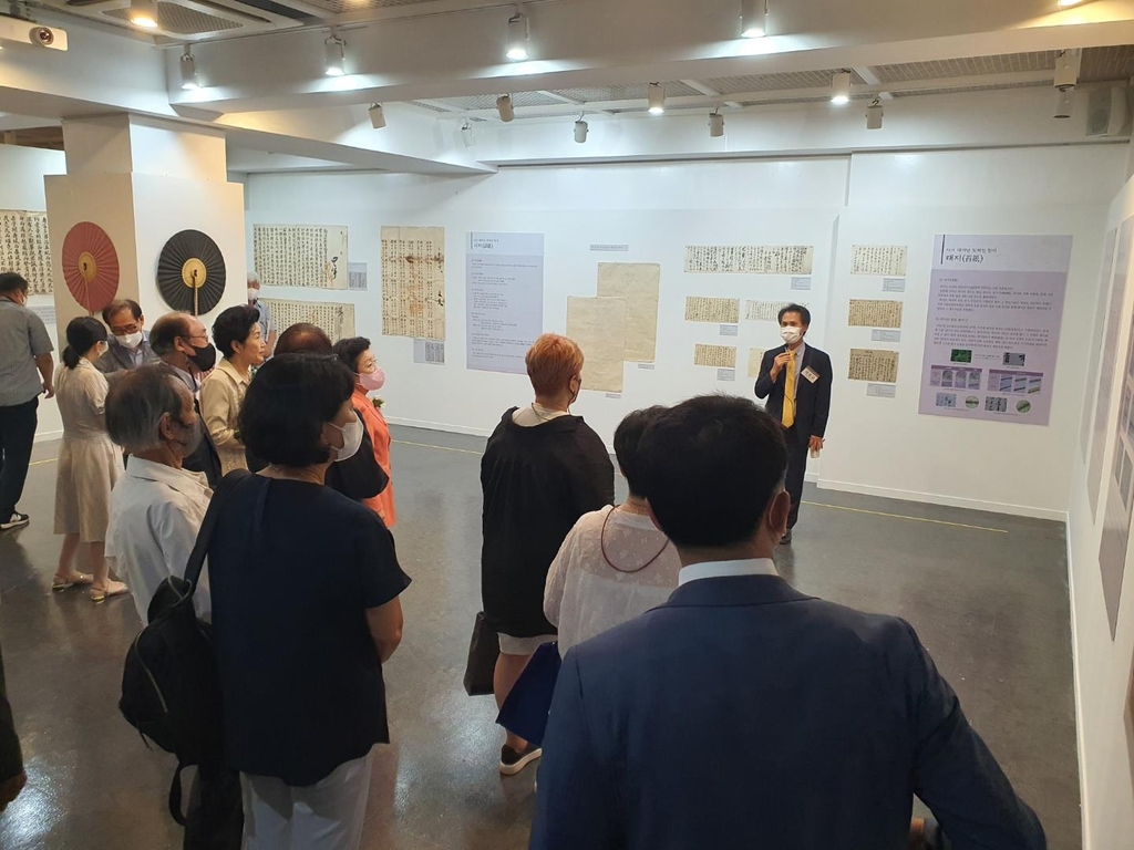 | ▲ 전통한지 전시회에 대해 설명을 듣는 참가자들 [왕길환 촬영] |