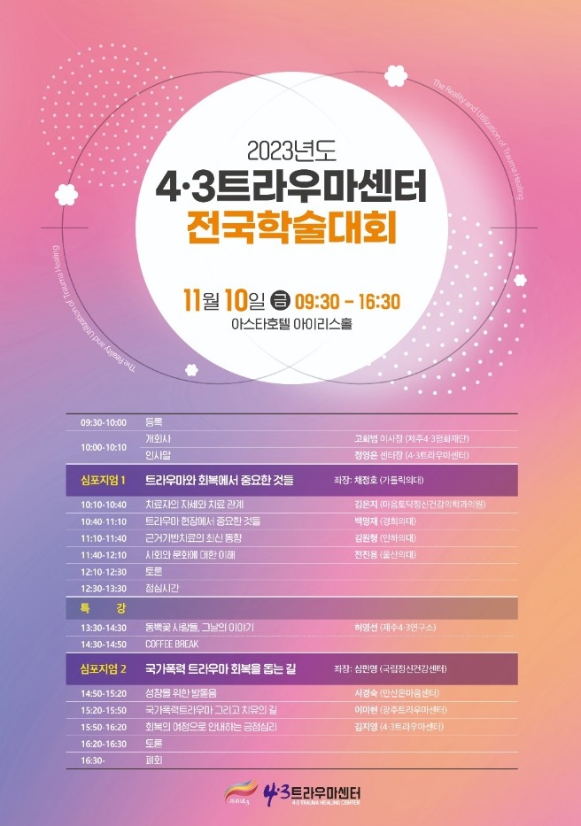 (제주=연합뉴스) 제주4·3평화재단은 10일 제주시 아스타호텔에서 2023년도 4·3트라우마센터 전국 학술대회를 개최한다.