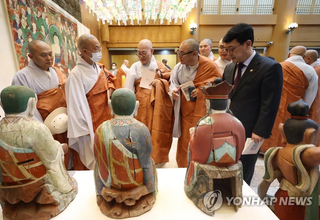 | ▲ 도난 성보 환수 고불식 (서울=연합뉴스) 신준희 기자 = 조계종 총무원장 진우스님 등이 23일 종로구 한국불교역사문화기념관에서 열린 도난 성보 환수 고불식에서 도난당했다가 되찾은 불교 문화유산 앞에서 예를 갖추고 있다. 2023.5.23 hama@yna.co.kr |