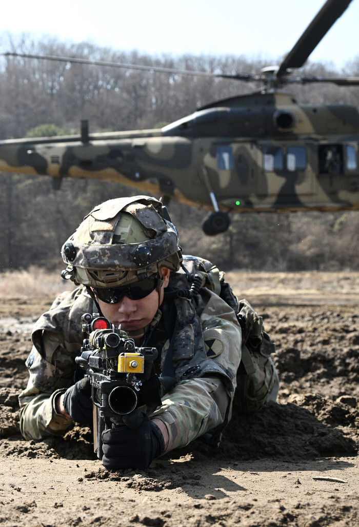 A U.S. soldier takes aim with his rifle after disembarking from a Surion military transport helicopter to head to a target area at a training ground in the South Korean border city of Paju on March 11, 2025, as part of a drill on airborne infiltrations. (Pool photo) (Yonhap)