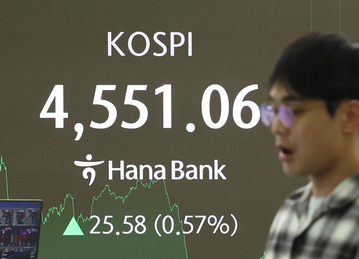 A financial data screen in the dealing room of Hana Bank in Seoul on Jan. 7, 2026, shows the benchmark Korea Composite Stock Price Index having risen 25.58 points, or 0.57 percent, to close at 4,551.06. Seoul shares extended their rally to set a fresh record high on a tech and auto rally after briefly going above the 4,600-point level. (Yonhap)