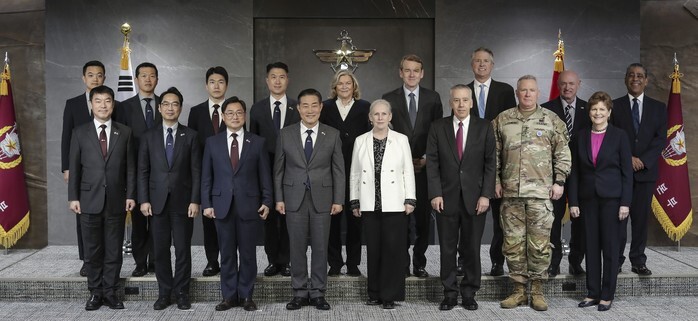 South Korean Defense Minister Shin Won-sik (4th from L, front row) poses for a photo with a U.S. delegation of six senators, including Kirsten Gillibrand (4th from R, front row), and a representative at the defense ministry in Seoul on March 29, 2024, in this photo provided by the ministry. (PHOTO NOT FOR SALE) (Yonhap)