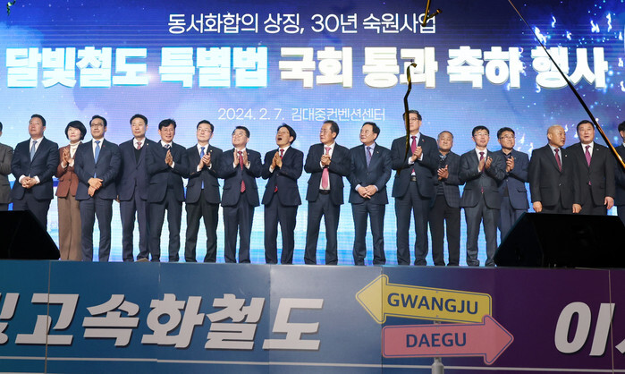 Daegu Mayor Hong Joon-pyo (9th from L), Gwangju Mayor Kang Gi-jung (8th from L) and other heads of regional governments in South Korea's southeastern and southwestern regions -- Yeongnam and Honam, respectively -- take part in a ceremony in the southwestern city of Gwangju on Feb. 7, 2024, to celebrate the National Assembly's passage of a bill aimed at constructing a 198.8-kilometer railway connecting Gwangju in Honam to Daegu in Yeongnam. (Yonhap)