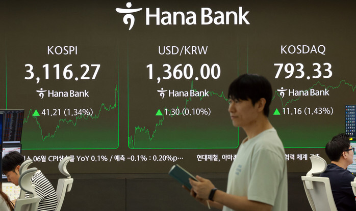 A financial data screen in the dealing room of Hana Bank in Seoul on July 3, 2025, shows the benchmark Korea Composite Stock Price Index having advanced 41.21 points, or 1.34 percent, to close at 3,116.27. South Korean stocks finished sharply higher as investor sentiment was buoyed by the revision of the shareholder-friendly Commercial Act and developments in tariff talks with the United States. (Yonhap)