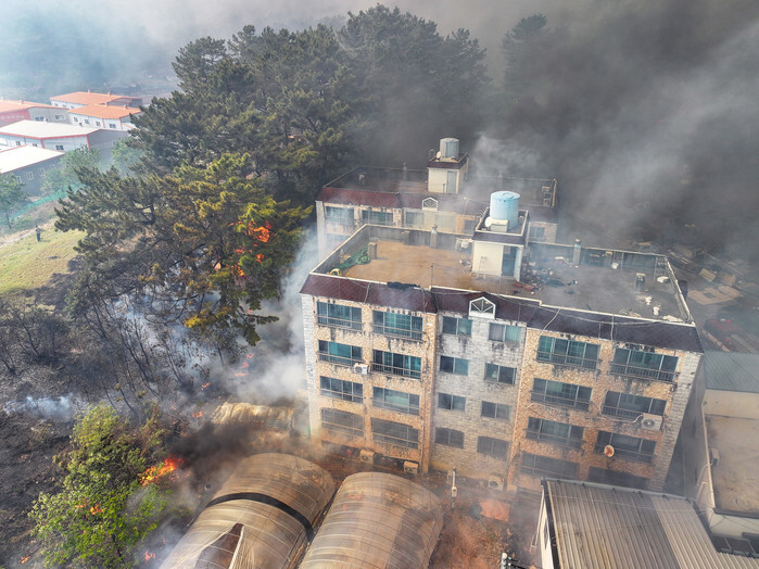 A wildfire spreads to a residential neighborhood near Mount Hamji in the southeastern city of Daegu on April 25, 2025. (Yonhap)