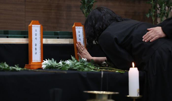 A bereaved family member sobs while touching the mortuary tablet of a Navy officer at an altar at the Navy Aviation Command in Pohang, North Gyeongsang Province, southeastern South Korea, on May 30, 2025, following a Navy patrol plane's crash the previous day that killed all four Navy officers aboard the maritime patrol aircraft. (Yonhap)