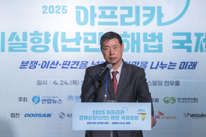 Yonhap News Agency President and CEO Hwang Dae-il speaks at the news agency's headquarters in Seoul on April 24, 2025, during a global forum, co-hosted by Yonhap and the United Nations High Commissioner for Refugees to address the issue of forced displacement in Africa, where more than 100 million people have lost their homes due to war, violence or persecution. (Yonhap)