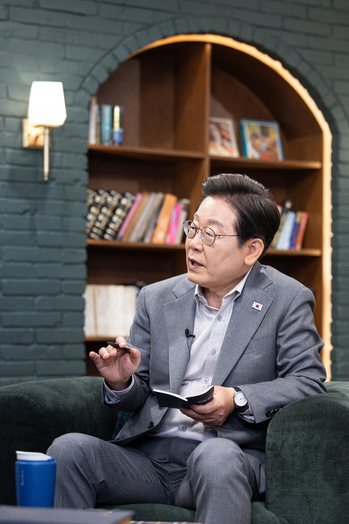 Lee Jae-myung, the presidential candidate of the liberal Democratic Party, speaks during a program aired live via YouTube at a studio in Seoul on May 26, 2025, ahead of the June 3 presidential election. (Pool photo) (Yonhap)