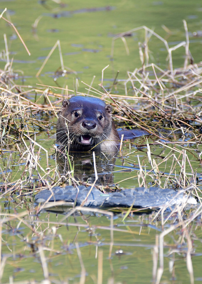 An otter searches for food at Yongbongje Reservoir in the southwestern city of Gwangju on April 1, 2025, in this provided photo. The otter, an endangered animal, is designated as the country's Natural Monument No. 330. (PHOTO NOT FOR SALE) (Yonhap)