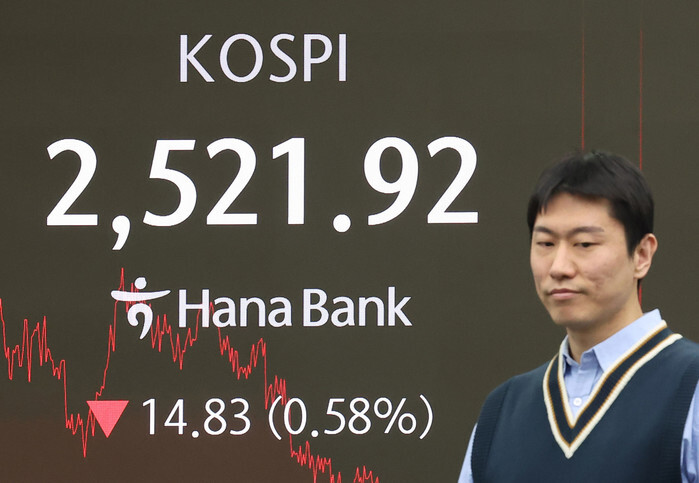 A financial data screen in the dealing room of Hana Bank in Seoul on Feb. 7, 2025, shows the benchmark Korea Composite Stock Price Index having retreated 14.83 points, or 0.58 percent, to close at 2,521.92. Seoul shares finished lower as investors sought to take profit following gains in the past three sessions. (Yonhap)