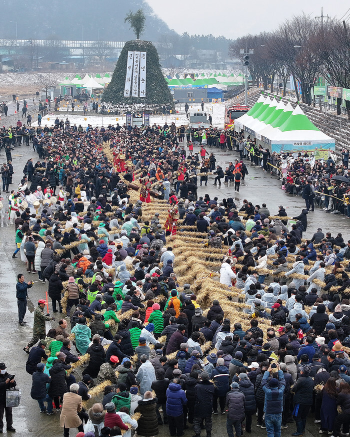People pull a 100-meter rice straw rope along a stream in Cheongdo, North Gyeongsang Province, southeastern South Korea, on Feb. 12, 2025. The tug-of-war, known as "doju juldanggigi," is part of festivities for Jeongwol Daeboreum, a traditional Korean holiday the same day that celebrates the first full moon of the year according to the lunar calendar. (Yonhap)