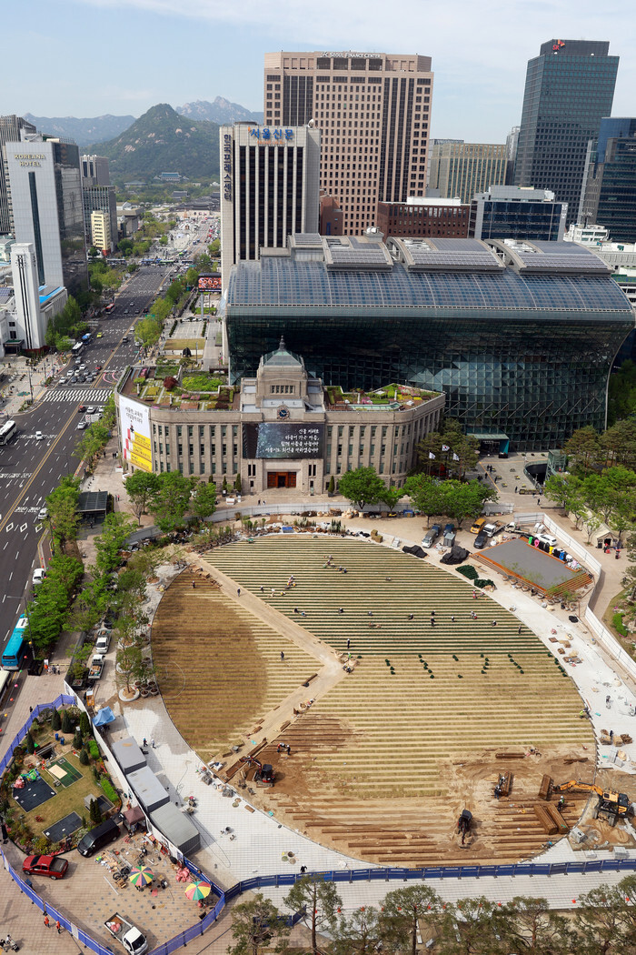Workers plant lawn grass at the plaza in front of Seoul City Hall on April 23, 2025, after it served as an ice rink in the winter. (Yonhap)