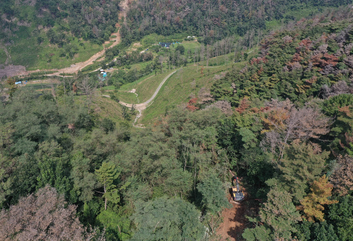 Work is under way to fell pine trees feared to have been infected with pine wilt in a forest in Miryang, South Gyeongsang Province, southeastern South Korea, on Sept. 16, 2025. (Yonhap)