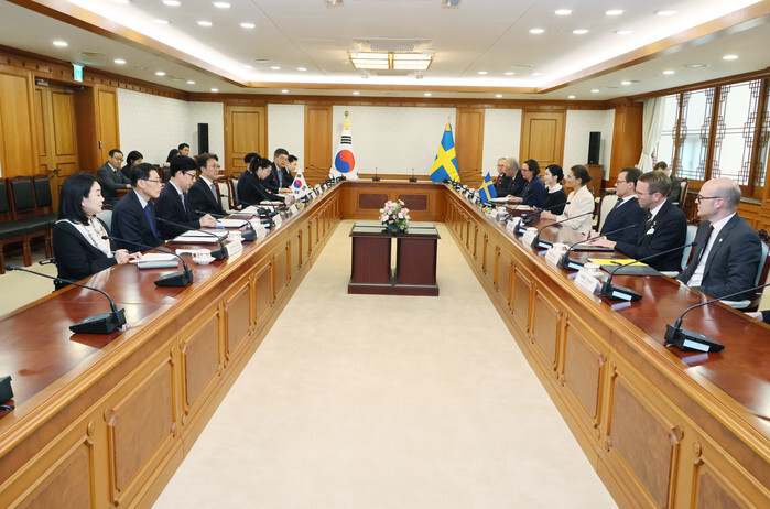 Prime Minister Kim Min-seok (4th from L) talks with Swedish Crown Princess Victoria (4th from R) during their meeting at the government complex in Seoul on Oct. 15, 2025. (Yonhap)