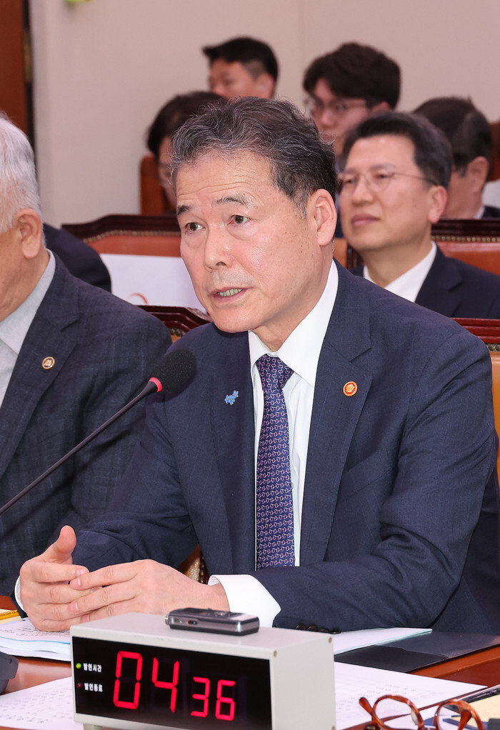 Unification Minister Kim Yung-ho, South Korea's point man on inter-Korean relations, speaks during a plenary session of the diplomacy and unification committee at the National Assembly in Seoul on March 11, 2025. (Yonhap)