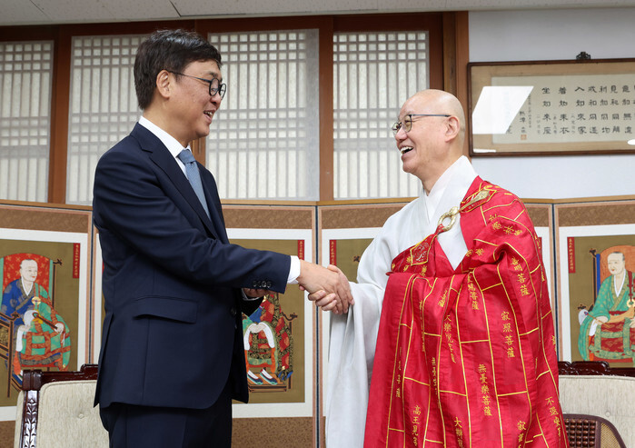 Culture, Sports and Tourism Minister Chae Hwi-young (L) meets with Ven. Sangjin, chief of the Taego Order, South Korea's second-largest Buddhist sect, during their meeting at the sect's headquarters in Seoul on Aug. 13, 2025, in this photo released by the culture ministry. (PHOTO NOT FOR SALE) (Yonhap)