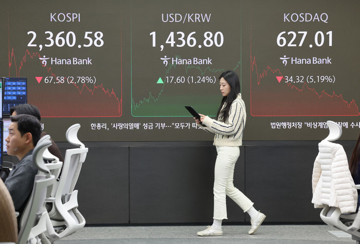 A screen in the dealing room of Hana Bank in Seoul shows the benchmark Korea Composite Stock Price Index (KOSPI) and tech-laden KOSDAQ tumbling 2.78 percent and 5.19 percent, respectively, on Dec. 9, 2024, amid political uncertainties following the scrapped parliamentary vote on the impeachment of President Yoon Suk Yeol. (Yonhap)