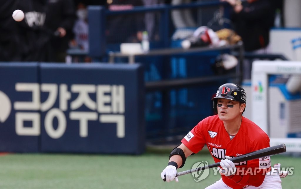 | ▲  In this file photo from Oct. 6, 2021, Choo Shin-soo of the SSG Landers attempts a sacrifice bunt against the LG Twins in the top of the first inning of a Korea Baseball Organization regular season game at Jamsil Baseball Stadium in Seoul. (Yonhap) |