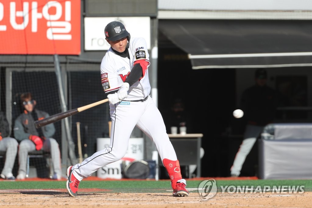 | ▲  Hwang Jae-gyun of the KT Wiz takes a swing against the Hanwha Eagles in a practice game at KT Wiz Park in Suwon, 45 kilometers south of Seoul, on Nov. 12, 2021, in preparation for the Korean Series. (Yonhap) |