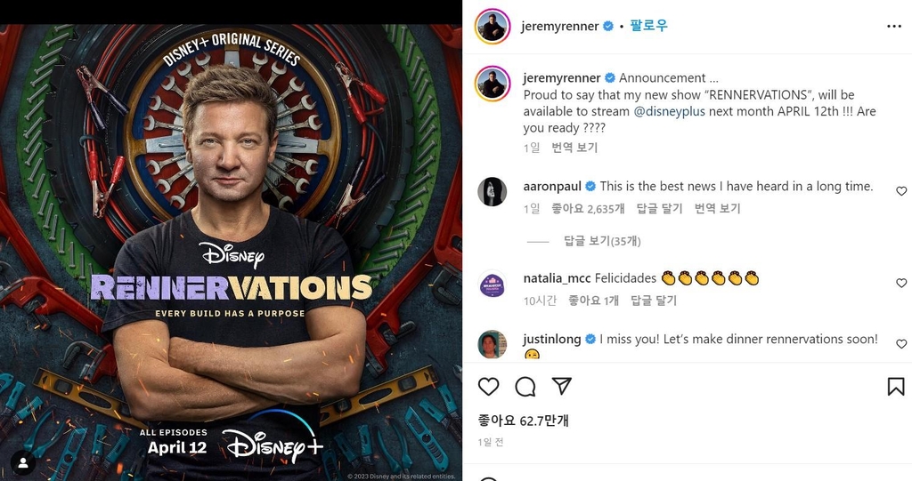 레너는 7일(현지시간) 인스타그램에 4월 12일부터 디즈니플러스에서 방송 예정인 '레너베이션'(RENNERVATIONS)의 예고편 영상을 올리면서 "내가 곧 돌아온다. 마침내 여러분과 (이 영상을) 공유하게 돼 매우 자랑스럽고 흥분된다"고 썼다.