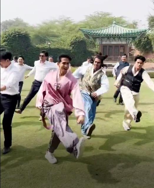 | ▲ 주인도한국대사관 내 정자 앞에서 진행된 커버댄스 군무. [SNS 영상 캡처. 재판매 및 DB 금지] |