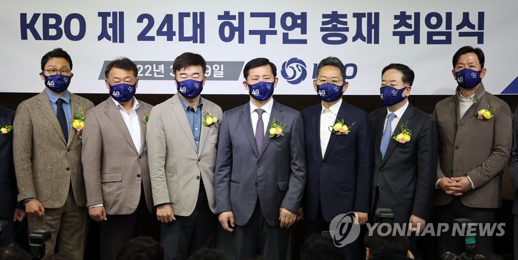 | ▲  Heo Koo-youn (C), new commissioner of the Korea Baseball Organization (KBO), poses for photos with presidents of KBO clubs before his inaugural press conference at the KBO headquarters in Seoul on March 29, 2022. (Yonhap) |