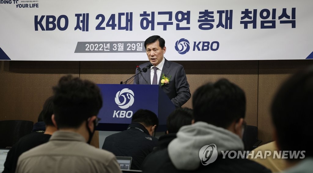 | ▲  Heo Koo-youn, new commissioner of the Korea Baseball Organization (KBO), speaks at his inaugural press conference at the KBO headquarters in Seoul on March 29, 2022. (Yonhap) |