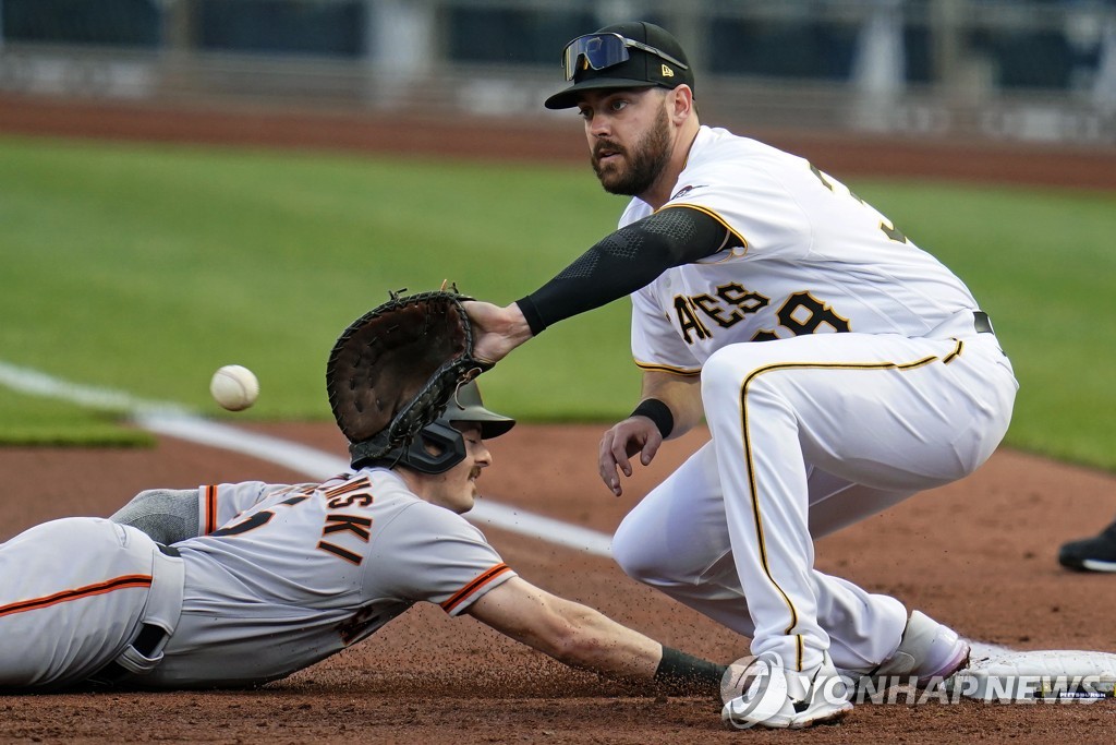 | ▲ In this Associated Press file photo from May 13, 2021, Pittsburgh Pirates first baseman Will Craig (R) receives a pickoff throw from pitcher Wil Crowe, as Mike Yastrzemski of the San Francisco Giants dives safely back to the bag during the top of the first inning of a Major League Baseball regular season game at PNC Park in Pittsburgh. (Yonhap) |
