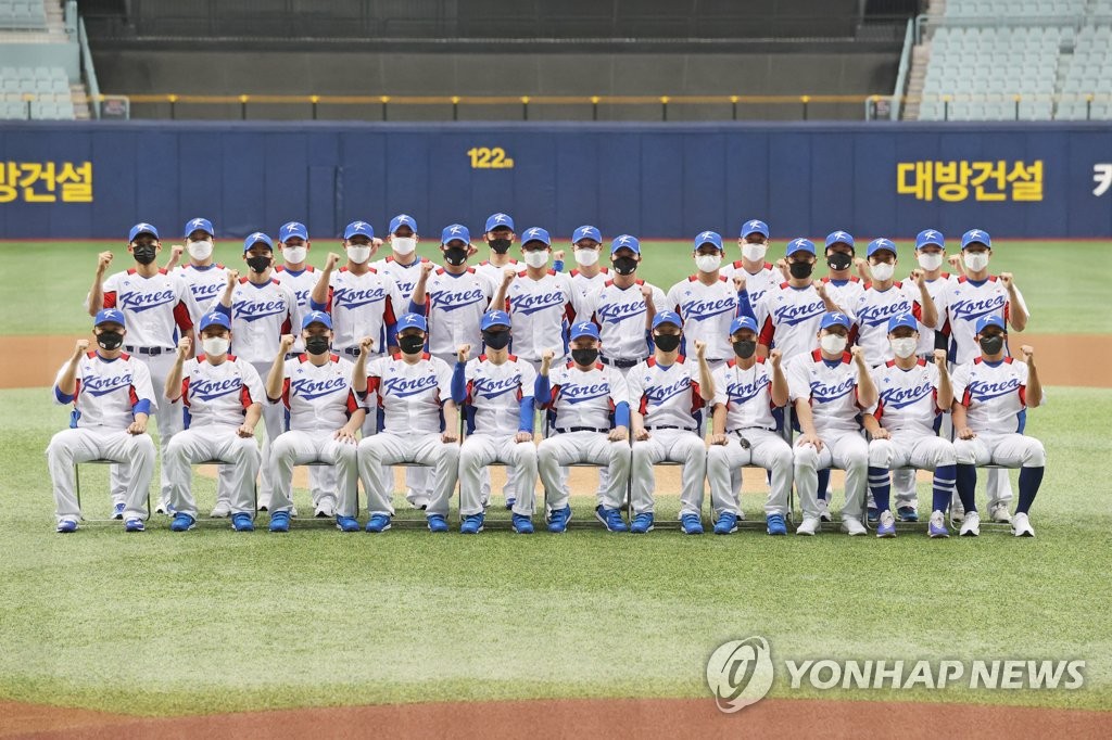 | ▲ South Korean Olympic baseball players pose for a team photo at Gocheok Sky Dome in Seoul on July 17, 2021. (Yonhap) |