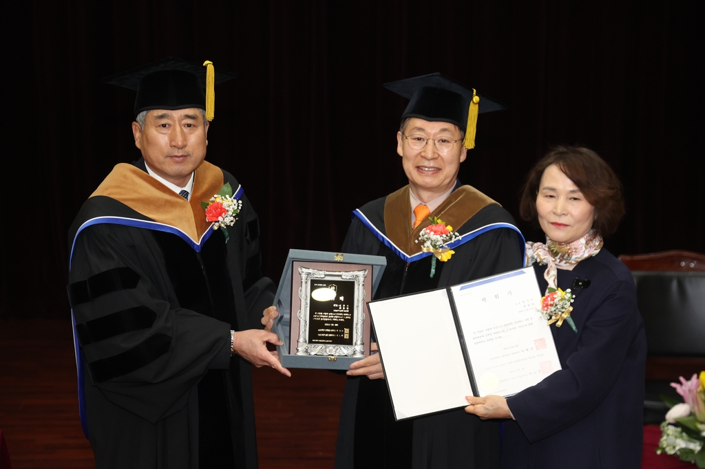 (서울=연합뉴스) 한국대중골프장협회 임기주 회장이 24일 안양대학교 명예 경영학 박사 학위를 받았다.