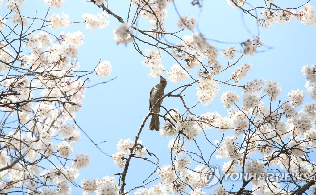 | ▲ A bird sits on a branch of a cherry blossom tree in Daegu, about 300 kilometers southeast of Seoul, on March 25, 2021. (Yonhap) |