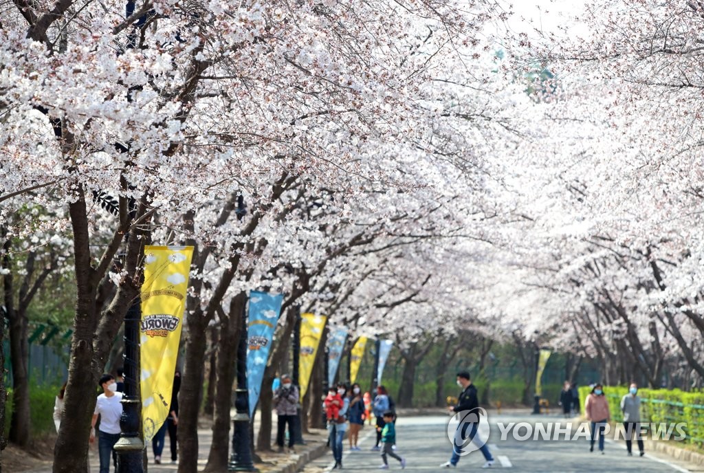 | ▲ People walk on a street full of cherry blossom trees in Daegu, about 300 kilometers southeast of Seoul, on March 25, 2021. (Yonhap) |