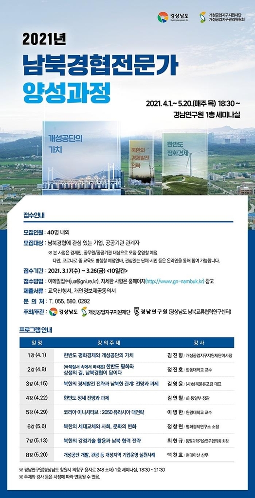 (창원=연합뉴스) 경남도와 개성공업지구지원재단이 주최하고 경남도 남북교류협력연구센터가 주관하는 '남북경협 전문가 양성과정'이 내달 1일부터 5월 20일까지 8주 동안 운영된다.
