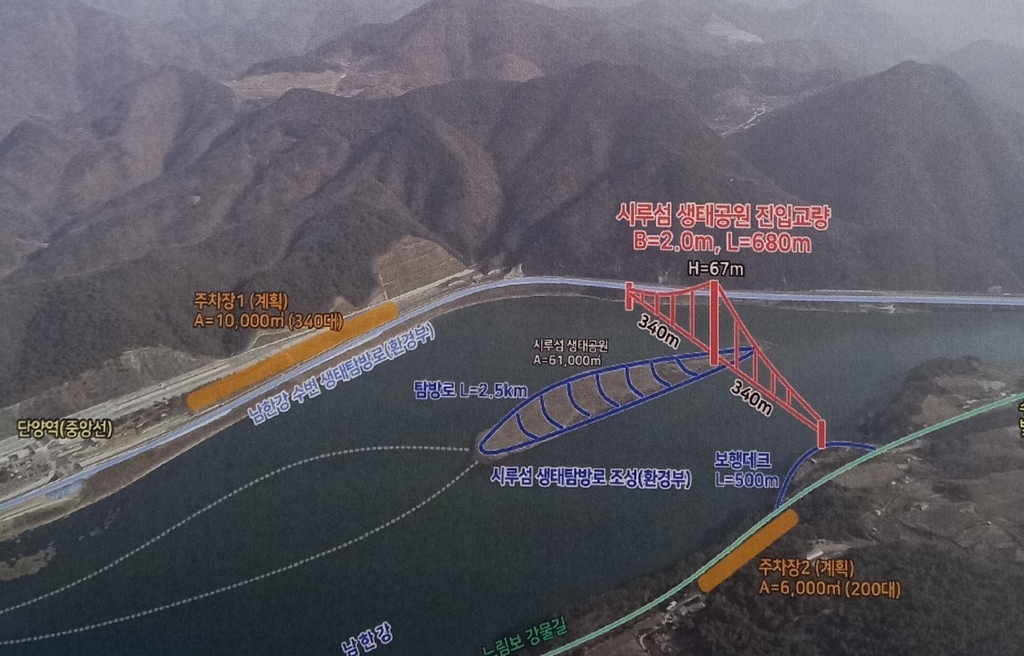 단양군도 시루섬 수질관리와 생태체험공간 조성 등을 위해 150억원을 들여 단양강과 시루섬을 가로지르는 680m 길이의 생태탐방교(폭 1.8m)를 내년 말까지 건설하기 위해 실시설계 용역 중이다.
