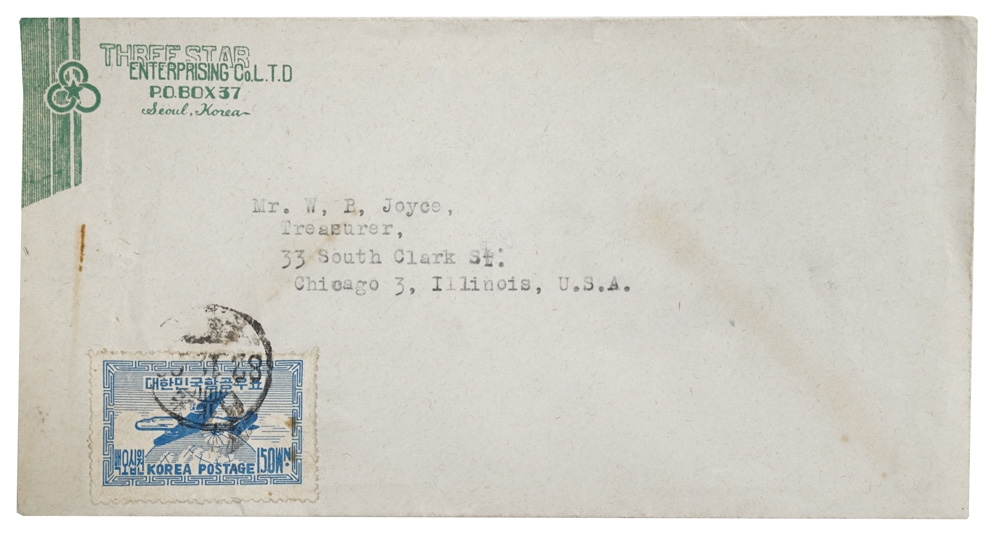 봉투 왼쪽 상단에는 '삼성'(三星)을 의미하는 것으로 추정되는 영어 문구인 '쓰리 스타'(THREE STAR)가 있고, 발신지는 한국 서울이다. 수신지는 미국 일리노이주 시카고로 기록됐다. 대한민국 항공우표가 붙어 있다.
